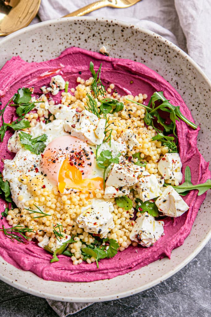 This vibrant breakfast bowl is definitely a game changer! Creamy horseradish beetroot topped with pearl couscous, feta and poached egg! Actually, forget breakfast. You can eat it all day long!