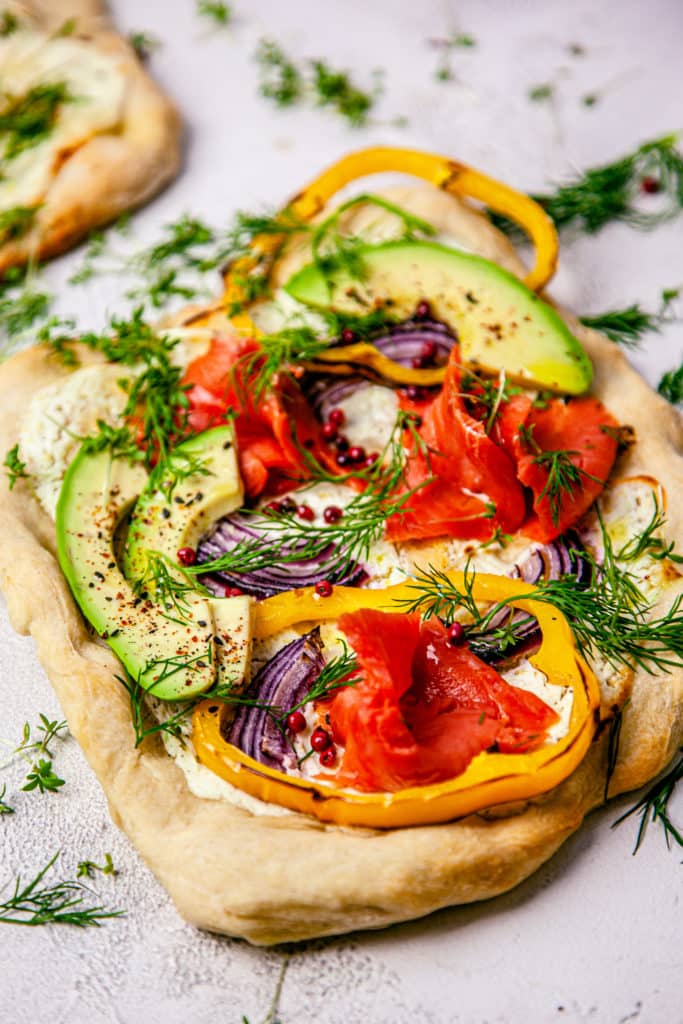 White base made from a mix of cottage cheese and feta, fresh dill and avocado. All topped with fresh wild smoked salmon.