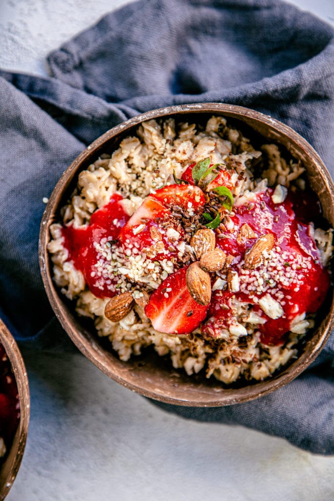 This summer edition warm porridge is of course made with strawberries. To be exact with strawberry pieces and puree.