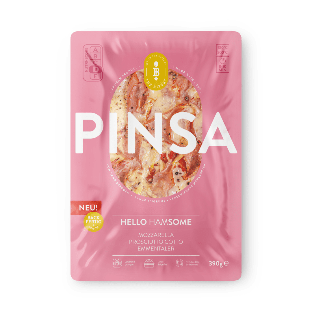 Wheat flour, water, tomato puree, cooked ham 12% (pork, salt, sugar, natural flavor, antioxidant (sodium ascorbate), preservative (sodium nitrite)), rice semolina, Emmental cheese 6.2% (pasteurized milk, salt, starter cultures, microbial rennet) , mozzarella cheese 5% (pasteurized milk, salt, starter cultures, microbial rennet), rice flour, salt, extra virgin olive oil, black pepper, yeast, dried oregano.